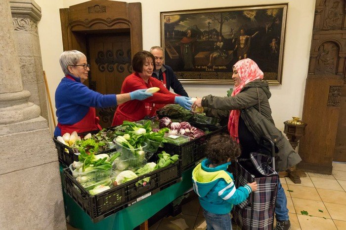 Immer mittwochs ist die Tür der Hochmeisterkirche geöffnet. Dann bereiten Ehrenamtliche aus der Gemeinde in der 46. Ausgabestelle der Aktion "Laib und Seele" alles vor und verteilen Lebensmittel an Bedürftige aus der Umgebung. Die Ausgabe der Lebensmittel beginnt um 12.30 Uhr und endet um 14.00 Uhr.