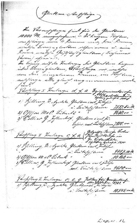 10.000 Mark sind im Bauetat der Hochmeisterkirche für die drei Glocken veranschlagt, Angebote werden eingeholt. [7] In einer Zusammenstellung, die eine sorgfältige Hand übersichtlich verfertigt hat, finden wir Vorschläge für 4 verschiedene Geläute, also 4 Dreiklangfolgen, und zu jedem Geläut Kostengebote von mehreren Gießereien für drei Glocken einschließlich Zubehör und Läutesystem (Abb. 1). [8]